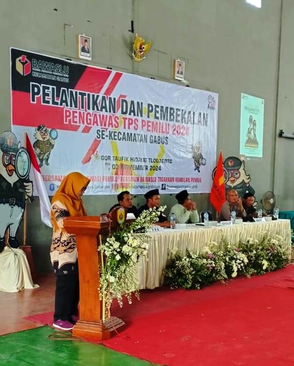 Ibu Sri Suhartini,S.Sos.,M.M selaku Plt. Camat Gabus menyampaikan dalam sambutannya: “Saya ucapkan selamat kepada bapak dan ibu yang pada hari ini telah dilantik menjadi petugas pengawas Tps Pada pilkada 2024 . Semoga amanah yang di berikan kepada bapak dan ibu menjadikan dedikasi dan kerja serta tanggung jawab dalam mensukseskan pilkada 2024. Saya harap bapak dan ibu menjaga kenetralitasan dan jaga kesehatan dalam pelaksanaan tahapan pungutan dan penghitungan pilkada 2024”.
